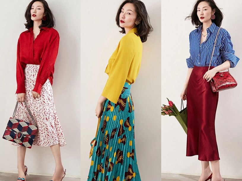 番茄红色衬衫搭配白底红花的半身裙,感觉很大气的配色,高级感满分,聚会时穿,分分钟摆脱路人感。蓝色条纹衬衫搭配罂粟红真丝半裙,大胆的撞色搭配,复古优雅,给人视觉上的冲击力,很有力量感的搭配,总裁范儿。