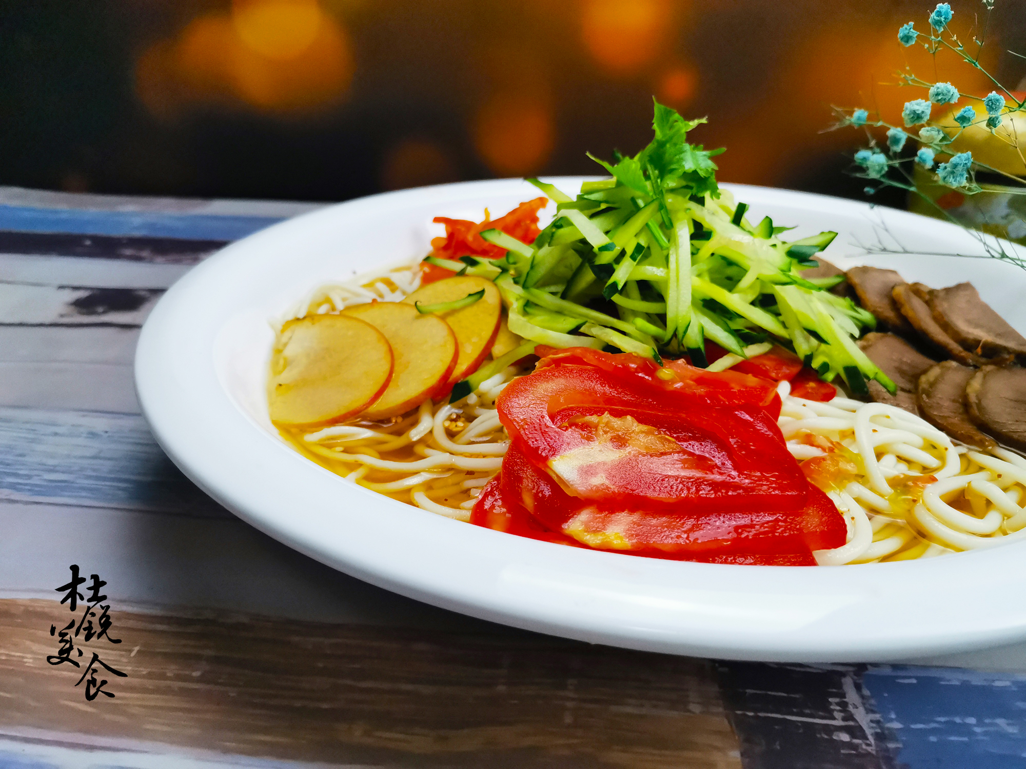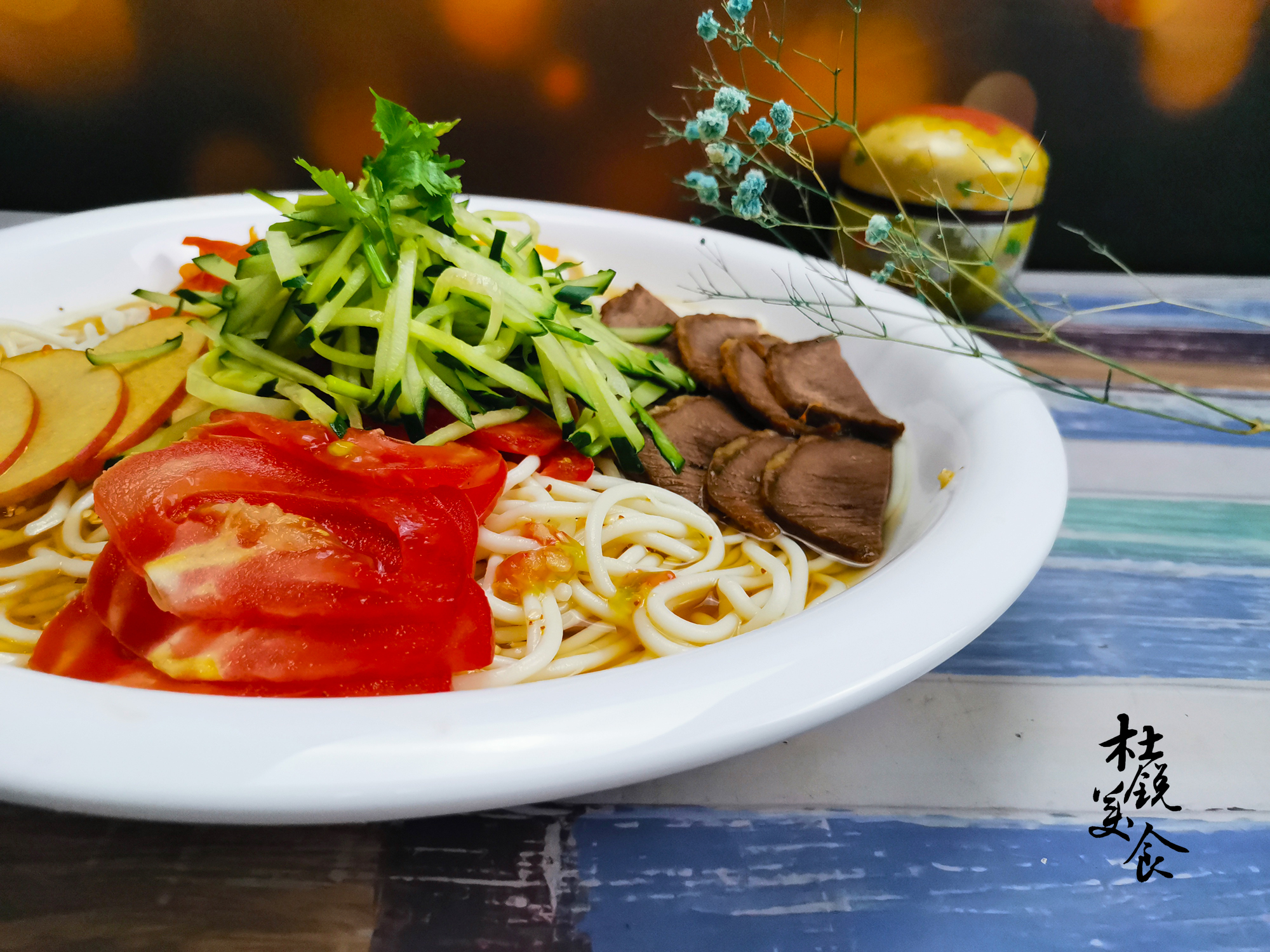 5、取一只较大点的阔口凹碗,挑入三分之一冷面条,摆上牛肉片、苹果片、西红柿片、黄瓜丝、熟鸡蛋片、辣白菜丝,浇淋上适量调配好的冷面味汁,最后撒上适量熟芝麻,点缀上香菜小段,这道家庭版“延吉冷面”就制作完成了。延吉冷面,十大面条之一,在家也能做,多加“1物”,味道更地道。记住分享给朋友们的这个小妙招,调味汁时巧借柠檬味的汽水。