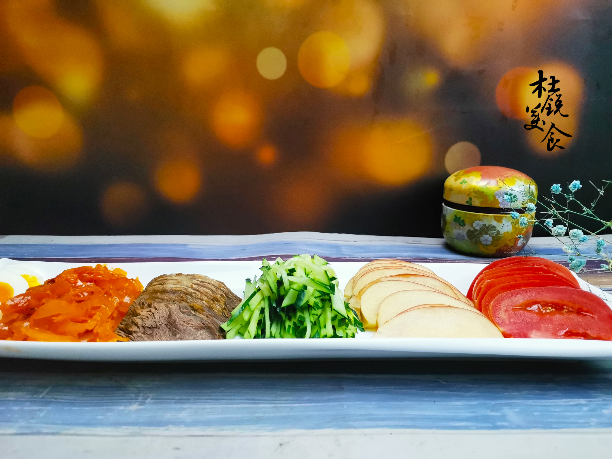 配料:卤牛肉150克、苹果1个、西红柿1个、黄瓜1根、辣白菜100克、鸡蛋3个、熟芝麻10克、香菜10克