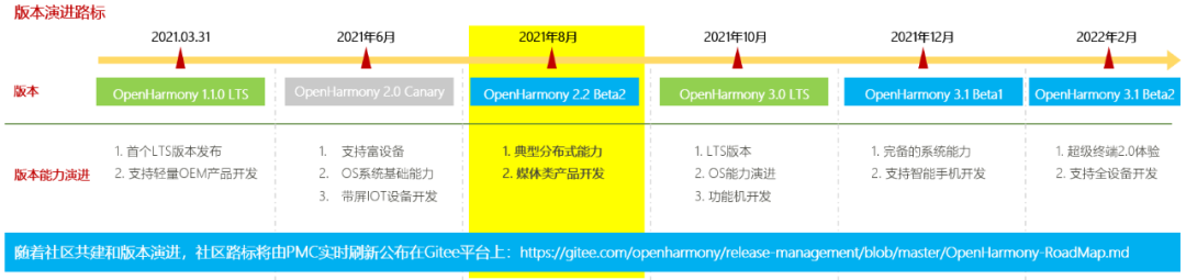 相较于 6 月 1 日,开放原子开源基金会发布的支持富设备的 OpenHarmony 2.0 Canary 版本,8 月 4 日发布的 OpenHarmony 2.2 Beta2 版本,支持分布式框架能力、分布式跨设备 Ability 流转、LiteOS-A 高效实时调度算法、轻量系统图形硬件加速渲染功能,及阶段性适配 DAYU 和树莓派等开发板,具备了典型分布式能力。