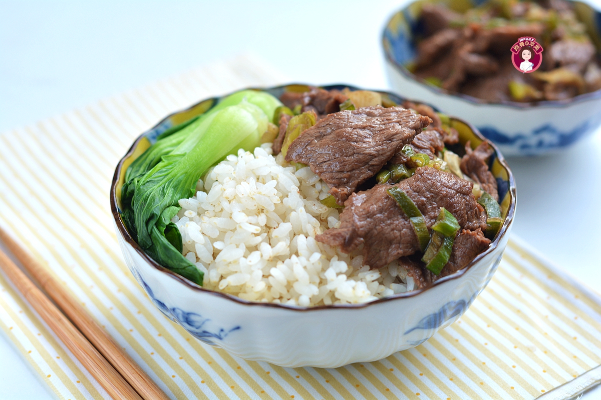 【材料】胚芽米适量,米饭用凉水适量,牛里脊200克,大葱半棵,油菜4棵,油适量,盐少许,酱油适量,料酒少许