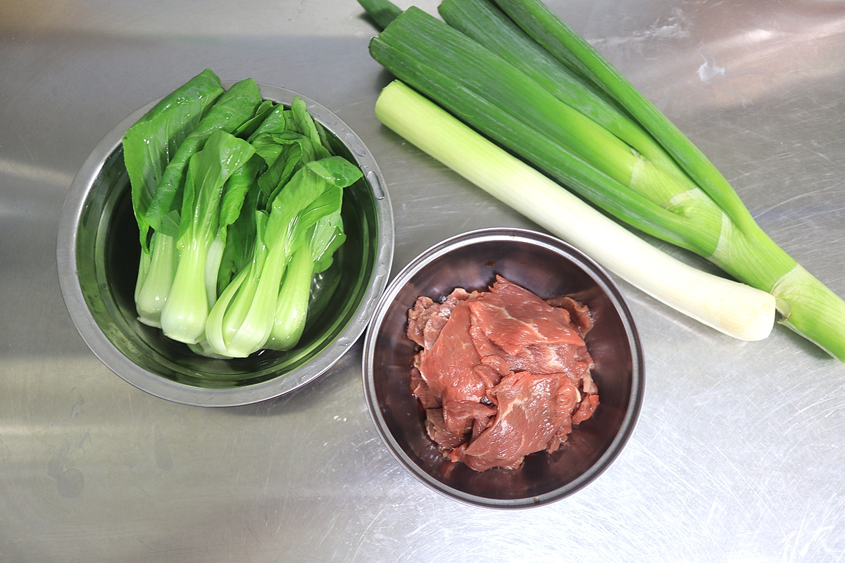 3. 大葱、油菜清洗干净;牛里脊切薄片,放少许淀粉和料酒抓捏上浆;