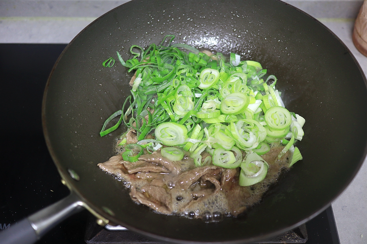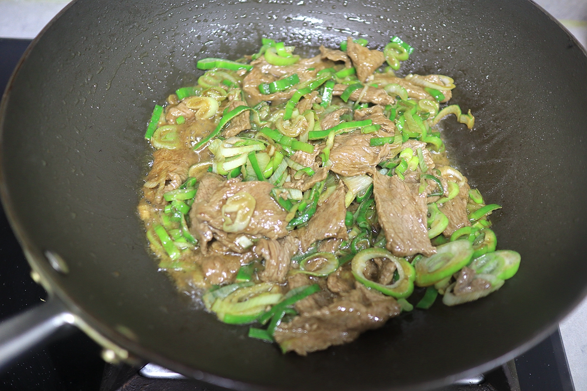 5. 牛肉表面变色后将葱花入锅翻炒;