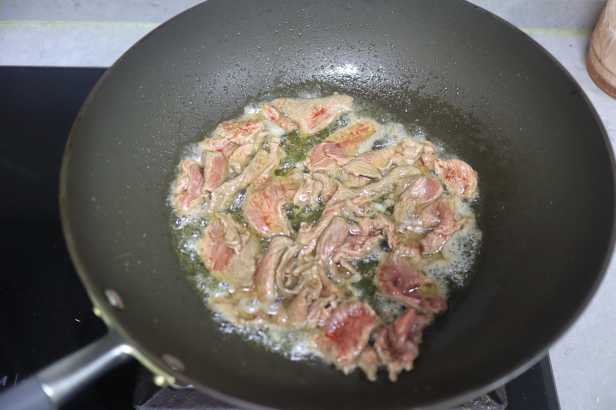 4. 热锅凉油,牛肉片入锅,用铲子迅速划散;