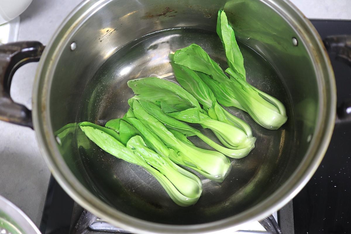 7. 另起一锅,水开后将油菜焯烫变色捞出;