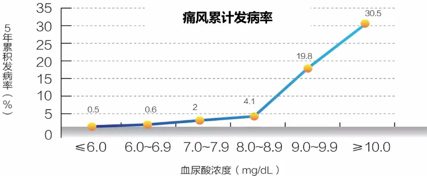 血尿酸水平增加,痛风发病率明显增加。当患者血尿酸≤7mg/dl时,5年内发生痛风的危险小于2%;当血尿酸≥10mg/dl时,超过30.5%的患者在5年内痛风就会发作。