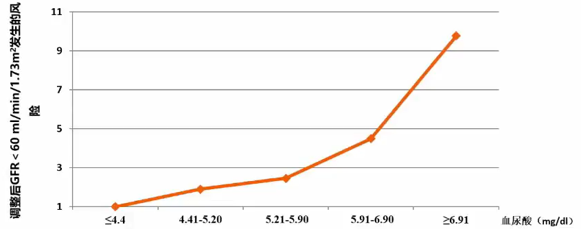 血尿酸升高增加慢性肾病发病风险。《美国肾脏病杂志》上曾刊登过一项大规模前瞻性长期随访研究(n=5808),该研究发现,血尿酸每升高1mg/dl,慢性肾病发病风险增加71%,肾功能恶化风险增加14%。