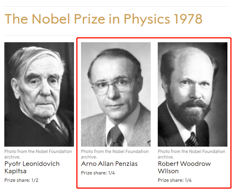 后来的事情大家都知道了,干扰并不是来自于鸽子,而是大名鼎鼎的宇宙微波背景辐射。这两个和鸽子斗智斗勇的人得到了半个诺奖: