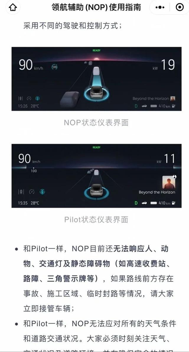 该指南也强调,“大家绝对不能把NOP等同于自动驾驶。与Pilot一样,NOP仍然是一种辅助驾驶功能,且随时可能在无法满足工作条件的情况下退出。在使用时,大家必须时刻关注交通状况及道路环境。”