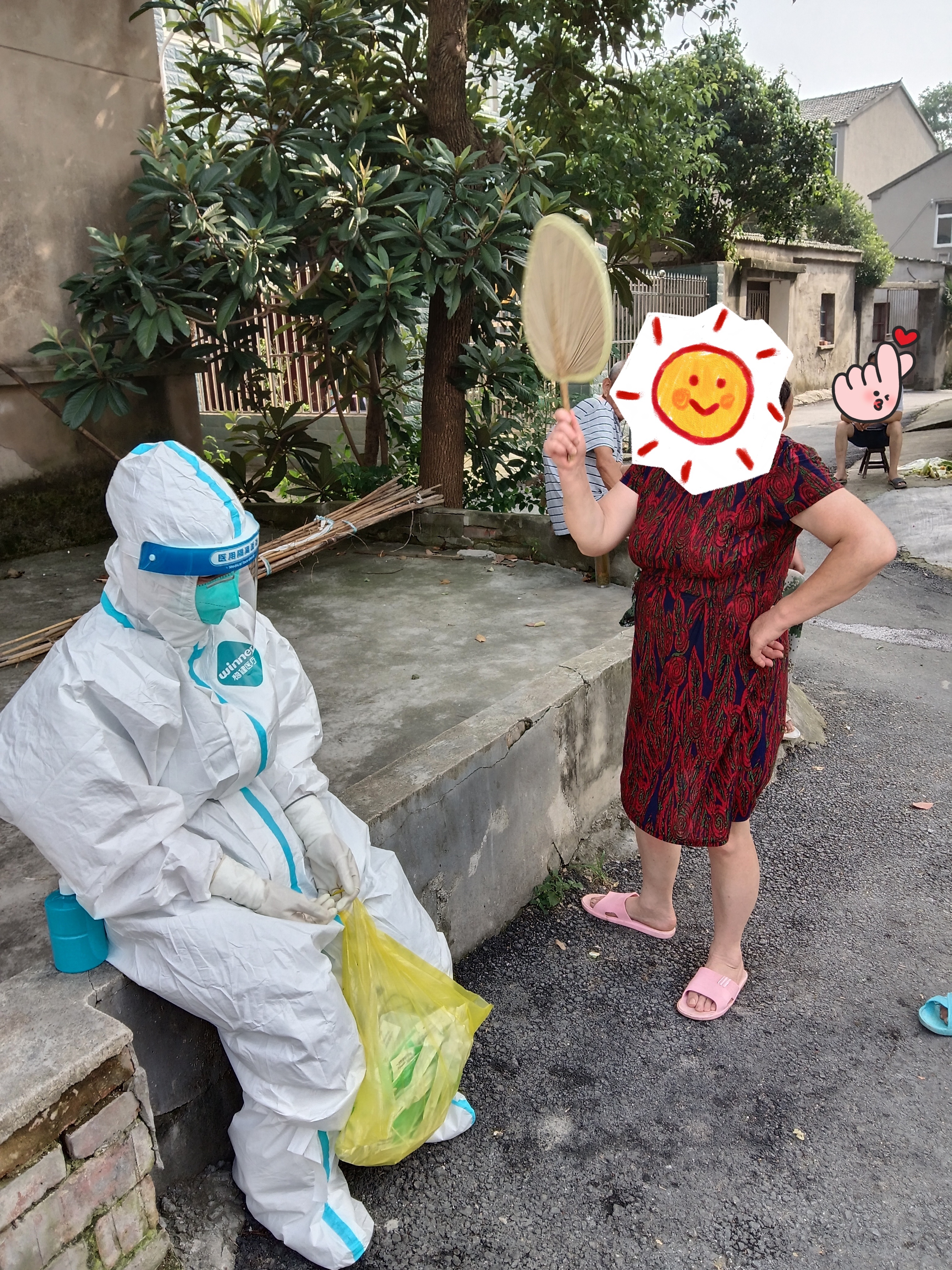 刚采集完核酸的老奶奶拿了一把蒲扇,迈着她不太灵活的腿脚来到项炜丽身边,一边给“全副武装”的项炜丽扇风一边称:“姑娘,天太热了,别中暑了,我给你扇扇!”虽说项炜丽连称没事、没事,老奶奶还是执意给她扇了好几下,待项炜丽去下一家了这才放心离开。