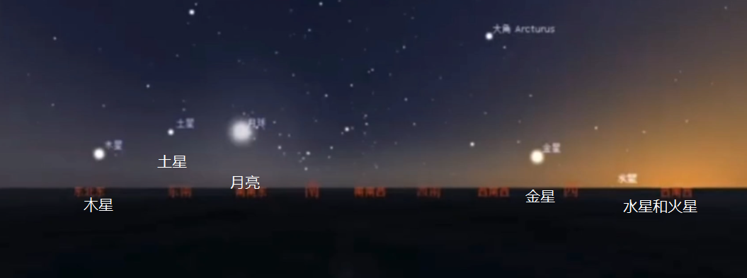 如果你对星象不是非常熟悉,可以对照着下图,确定好月亮的位置,然后就可以看到从左向右分别是:木星、土星、金星、水星和火星。