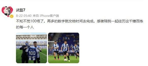 而在个人社交媒体上,武磊也是发表了留洋百场的感受,他晒出纪念球衣,并写道:“不知不觉100场了。再多的数字就交给时间去完成。感谢陪我一起经历这千锤百炼的每一个人。”