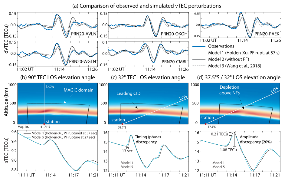 好了,且不问具体的技术手段,现在我们得到了观测数据,要拟合上断层破裂,好像还差了十万八千里。我们再来看看具体的技术流程:首先采用本次地震事件中较好的两个有限断层模型。然后通过空间物理的模型,模拟在这样的断层模型下次声波的传播,最后通过次声波的传播去模拟电离层总电子含量的变化。具体的物理量转化,这里就不细究了