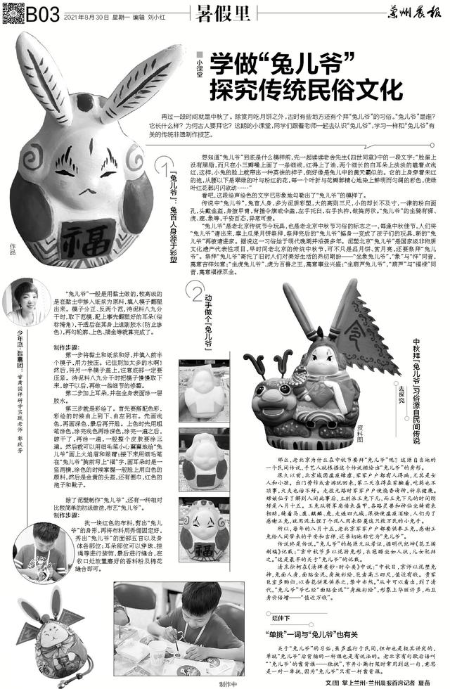 再过一段时间就是中秋了。除赏月吃月饼之外,古时有些地方还有个拜“兔儿爷”的习俗。“兔儿爷”是谁?它长什么样?为何古人要拜它?这期的小课堂,同学们跟着老师一起去认识“兔儿爷”,学习一样和“兔儿爷”有关的传统非遗制作技艺。