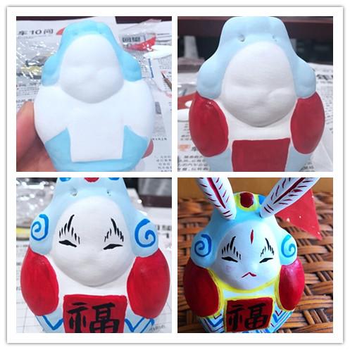第三步就是彩绘了。首先要搭配色彩,彩绘的时候由上到下、由左到右。先画浅色,再画深色,最后再开脸。上色时先用粗笔涂色,涂完浅色再涂深色,涂完一遍之后,晾干了,再涂一遍,一般整个皮肤要涂三遍。然后就可以用细毛笔小心翼翼地给“兔儿爷”画上火焰眉和眼睛;接下来用细毛笔在“兔儿爷”胸前写上“福”字,画耳朵时是一竖两横,涂色的时候掌握一般脸上用白色的颜料,然后是金黄的头盔,还有围巾,红色的袍子和靴子。