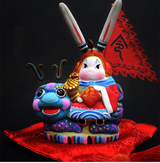 “兔儿爷”一般是用黏土做的,较高级的是在黏土中掺入纸浆为原料,填入模子翻塑出来。模子分正、反两个范,待泥料八九分干时,取下范模,配上事先翻塑好的耳朵(俗称犄角),干透后在其身上追刷胶水(防止渗色),再勾轮廓、上色、描金等就算完成了。