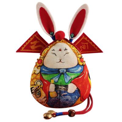 找一块红色的布料,剪出“兔儿爷”的身形,再将布料用秀绷固定好,秀出“兔儿爷”的面部五官以及身体各部位;耳朵部位可以穿珠、挂绳等进行装饰,最后进行缝合,在收口处放置磨好的香料粉及棉花缝合即可。