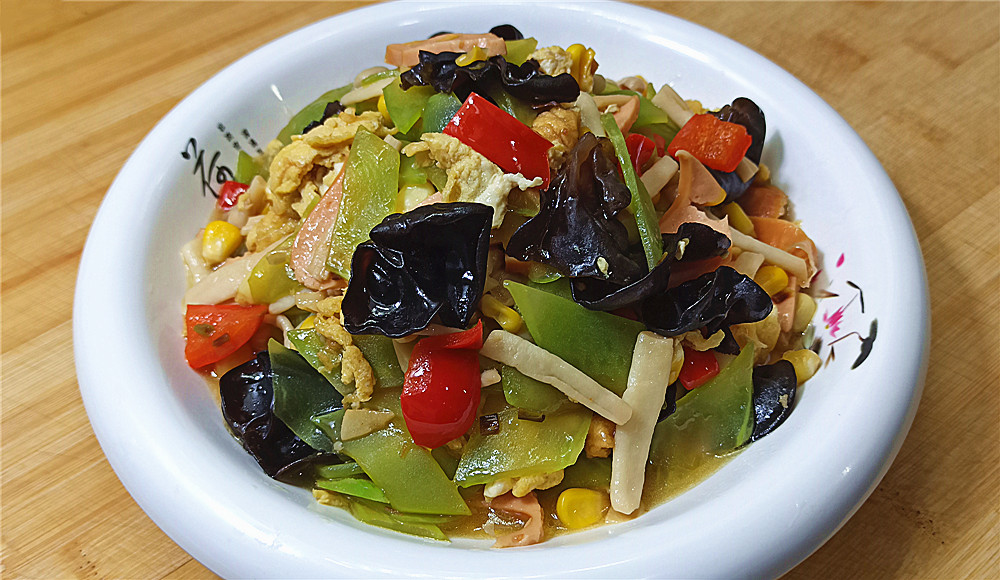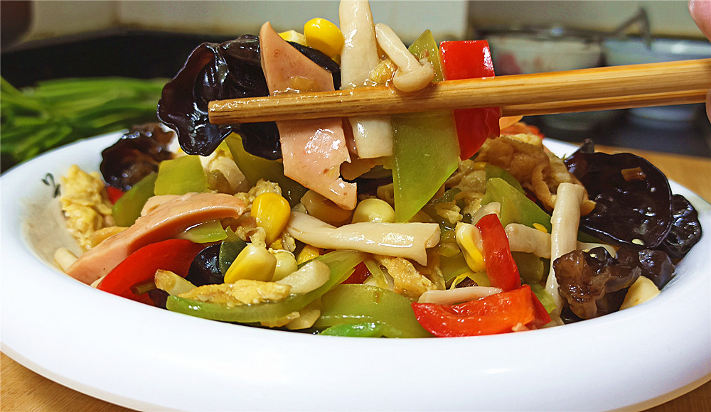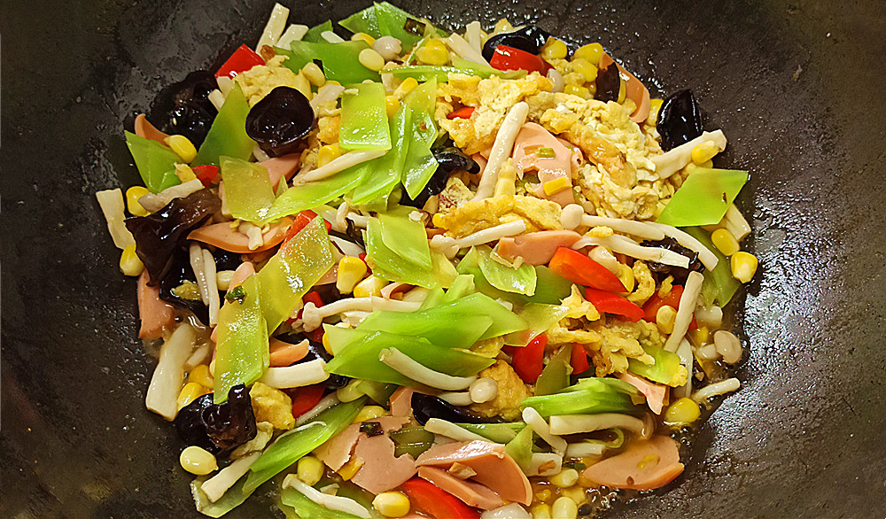 【制作主料】:莴笋1根、玉米肠1根、玉米1把、泡发木耳1把、甜椒1个、海鲜菇1把、鸡蛋3个