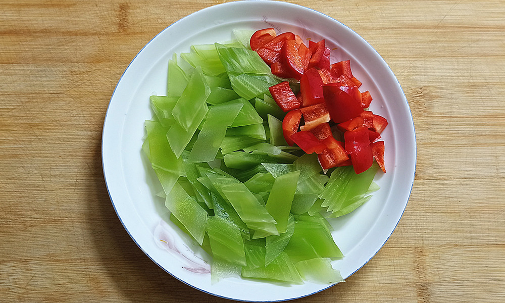 【步骤一】:把莴笋去皮,然后改刀切成菱形块,再切成菱形片,甜椒把籽去掉切成小块,把它们分别装盘备用。