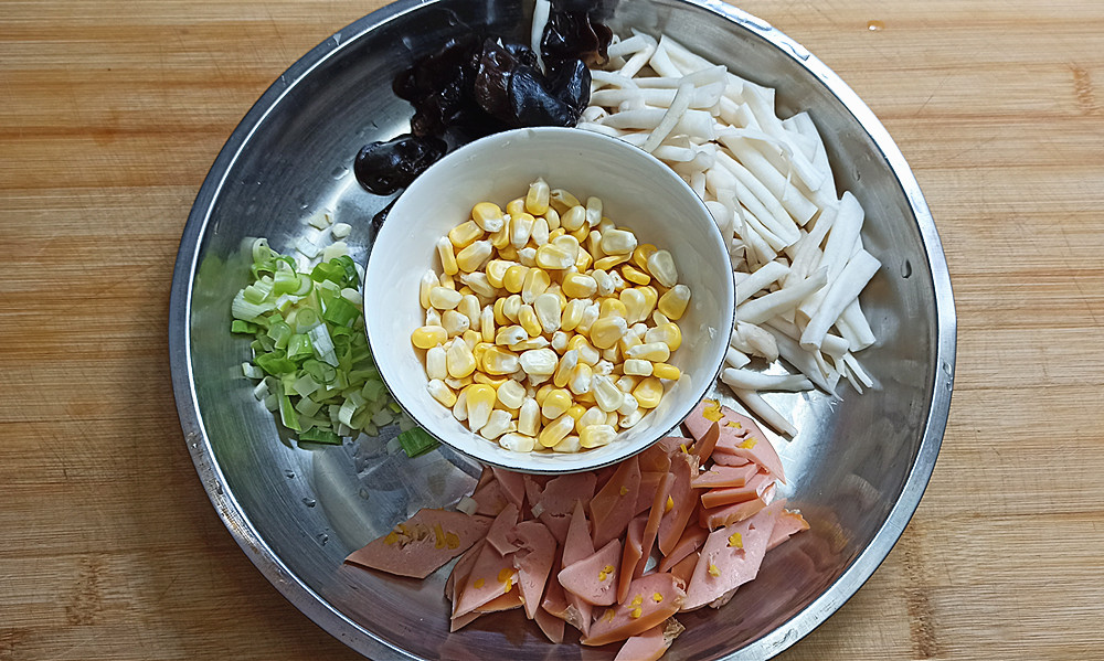 【步骤二】:海鲜菇清洗干净切成小段、泡发的木耳清洗干净、玉米肠改刀切成菱形片、玉米粒扒下来清洗干净、香葱和大蒜切成末,然后分别装盘备用。