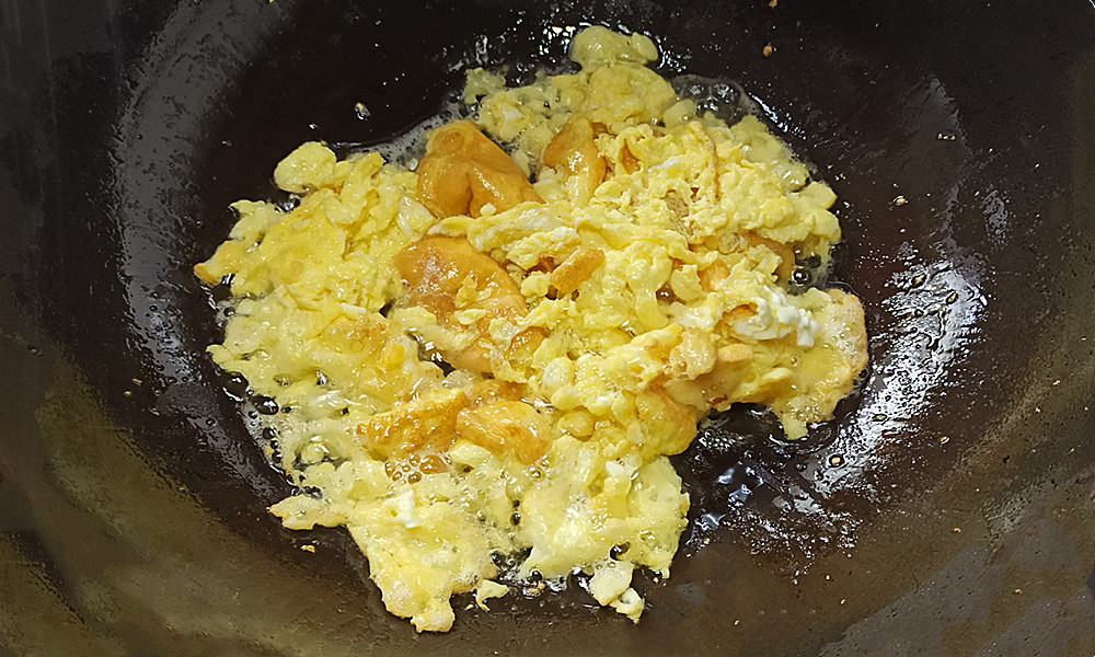 【步骤六】:锅中放一勺油,大火烧热,把鸡蛋倒入锅中,炒出金黄色,然后剁成小块盛出来备用。