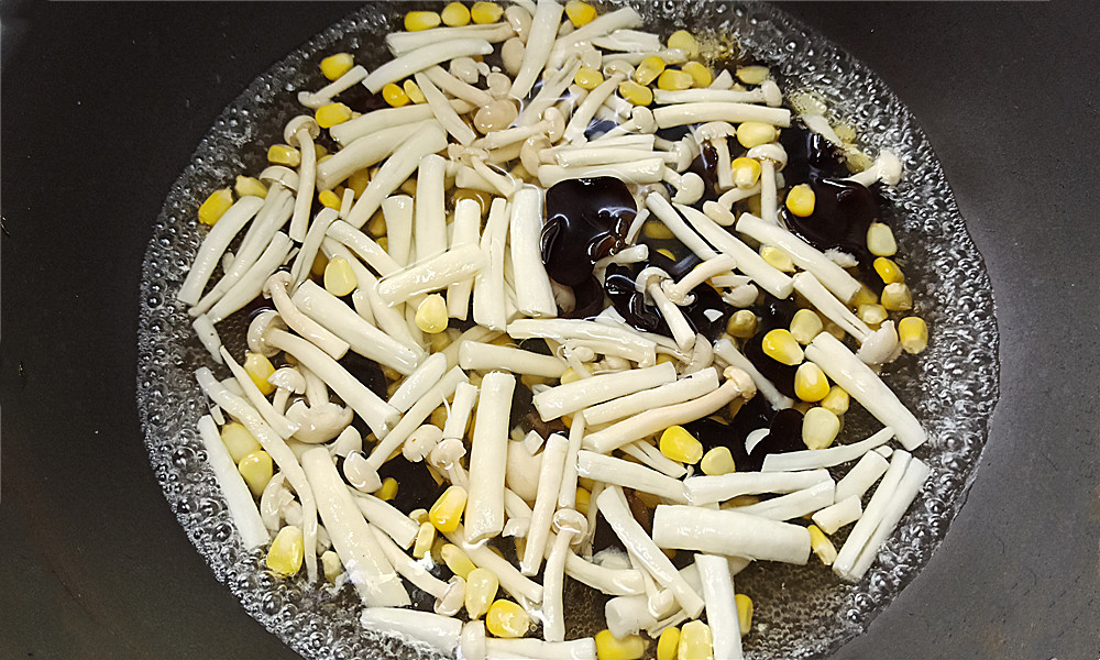 【步骤五】:玉米粒煮熟,倒入海鲜菇和木耳,焯水1分钟,把木耳和海鲜菇简单焯烫一下,然后捞出来把水沥干。