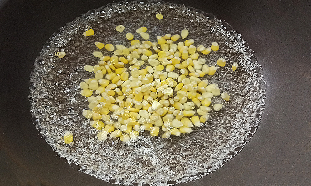 【步骤四】:锅中添水大火烧开,把玉米粒倒入锅中,焯水3分钟,把玉米粒煮熟。