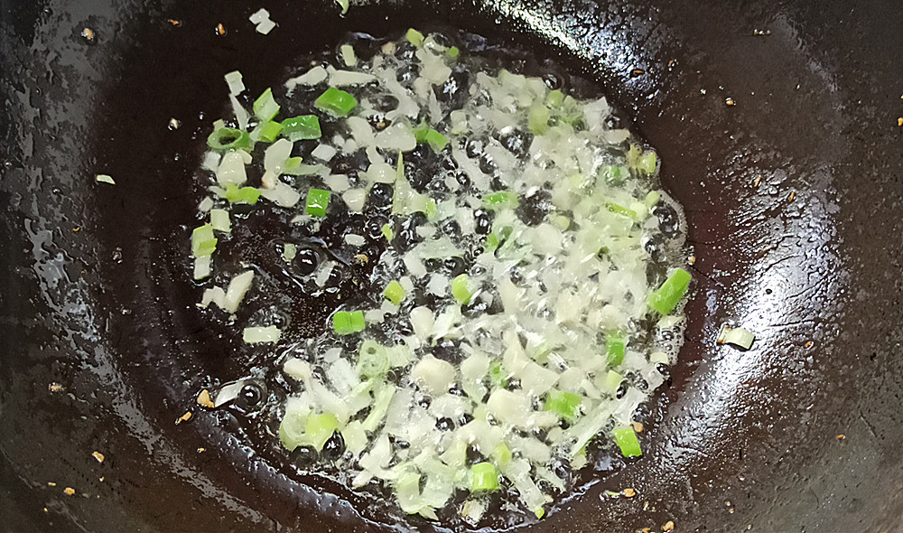 【步骤七】:重新起锅放少许油,开小火把葱蒜放里边炒出香味。