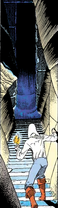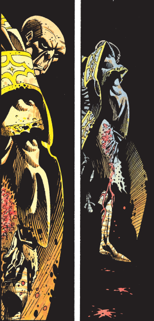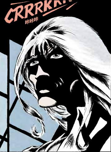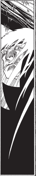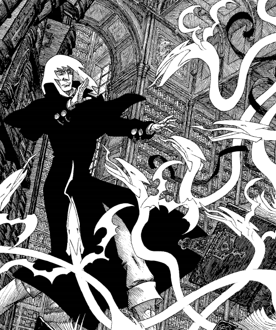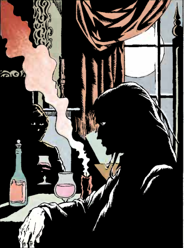 我为他画了长头发,因为那时候我留的也是长发。我决定头发的颜色是白色的,这样正好和他的黑色大衣形成强烈的对照。刚开始的时候,我会偶尔给他的大衣画出一些细节来,但很快就打消了这个念头。”