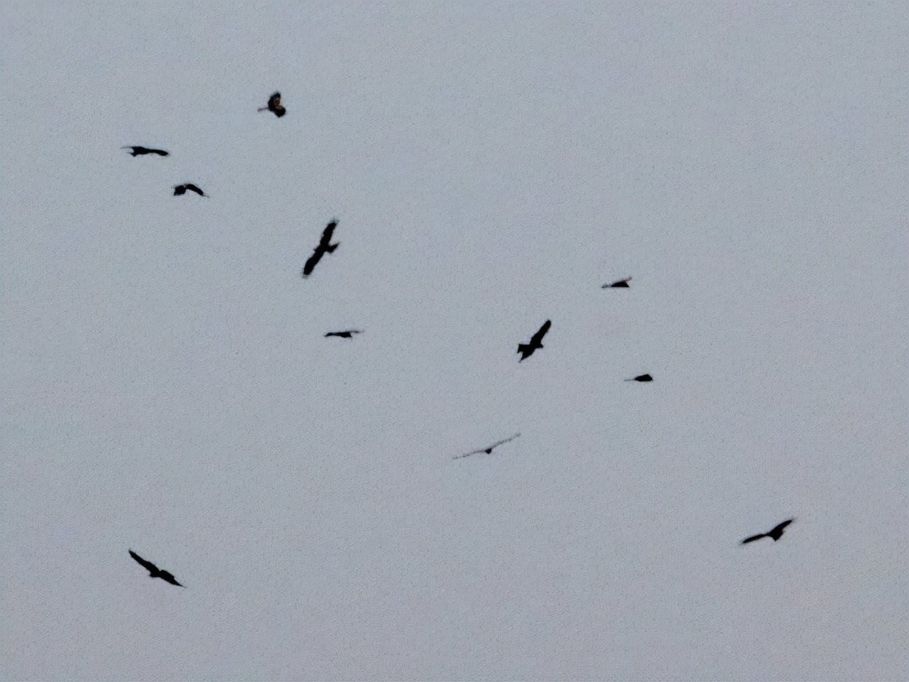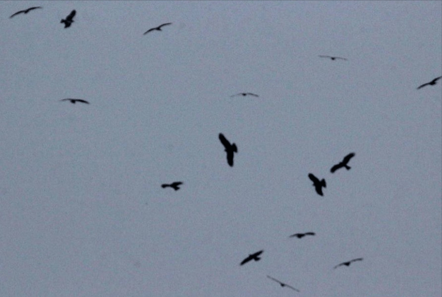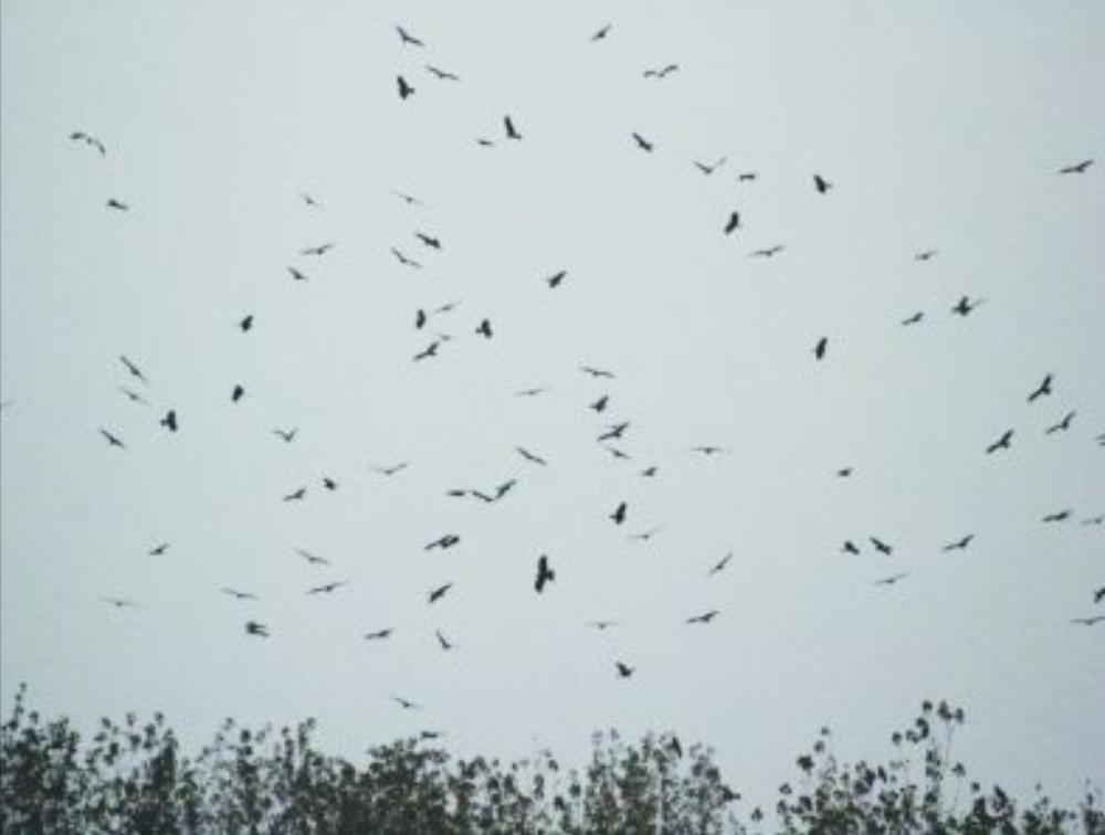 还有一种情况就是黑耳鸢狩猎迁徙的鸟类,要知道的是它们食谱上有鸟类,当秋季南迁的鸟儿们飞到南京上空时,有可能遭遇黑耳鸢的群而攻之。迁徙的鸟儿们一般是成群迁徙,其中体型越小的鸟类,迁徙时组成的鸟群越大,这就有可能会吸引大量的黑耳鸢前来觅食。