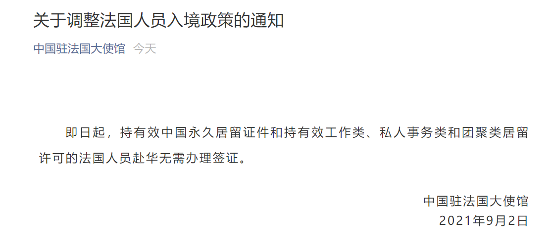 今日,据中国驻法国大使馆官方微信通知,即日起,持有效中国永久居留证件和持有效工作类、私人事务类和团聚类居留许可的法国人员赴华无需办理签证。