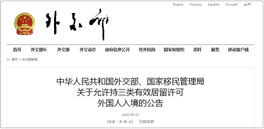 此前,据外交部2020年9月23日通知,根据当前新冠肺炎疫情形势及防控需要,现对2020年3月26日外交部、国家移民管理局联合发布的《关于暂时停止持有效中国签证、居留许可外国人入境的公告》部分措施调整如下: