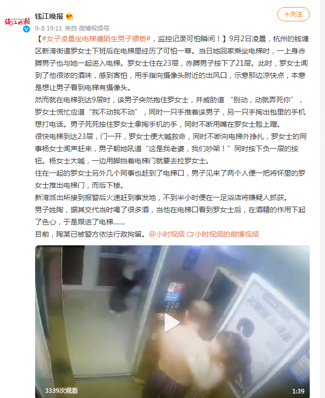 9月2日凌晨,杭州的钱塘区新湾街道罗女士下班后在电梯里经历了可怕一幕。当日她回家乘坐电梯时,一上身赤膊男子也与她一起进入电梯。罗女士住在23层,赤膊男子按下了21层。此时,罗女士闻到了他很浓的酒味,感到害怕,用手指向摄像头附近的出风口,示意那边凉快点,本意是想让男子看到电梯有摄像头。