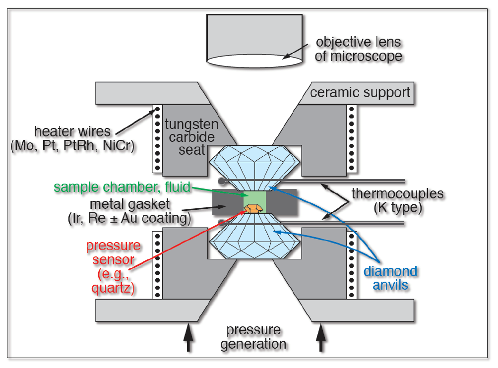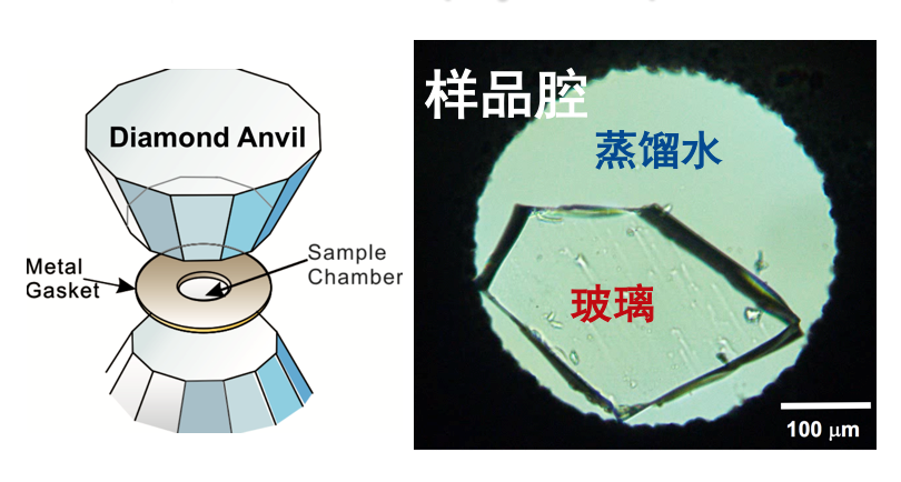 由于金刚石是自然界最硬的矿物,且具有良好的导热性和高温稳定性,所以该装置主要是利用两颗大小、形状、设计和物理性质基本一致的金刚石和一个带孔的金属垫片形成一个封闭的样品腔,通过外部加热和机械加压模拟地球内部的高温高压环境。