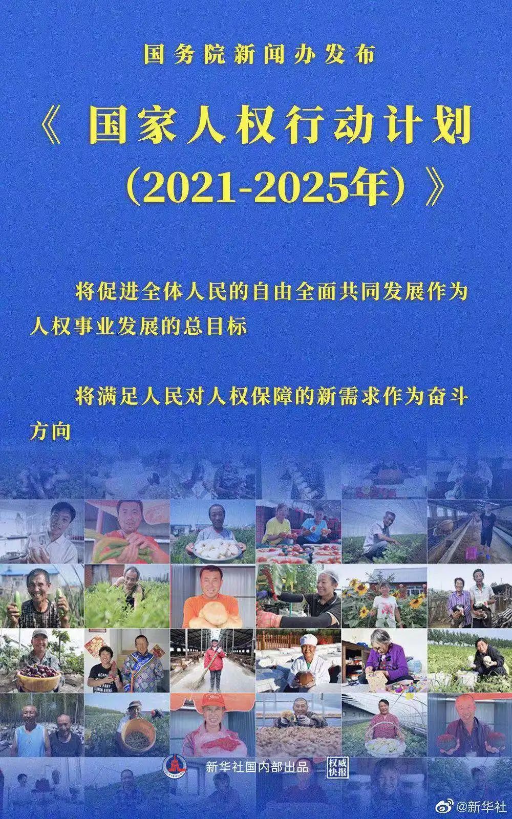 国务院新闻办9日发布《国家人权行动计划(2021-2025年)》。行动计划指出,全面建设社会主义现代化国家是中国人权事业发展的新起点。制定和实施行动计划,使全体人民的各项人权得到更高水平的保障,不断增强人民对于人权保障的获得感、幸福感、安全感。(新华社)