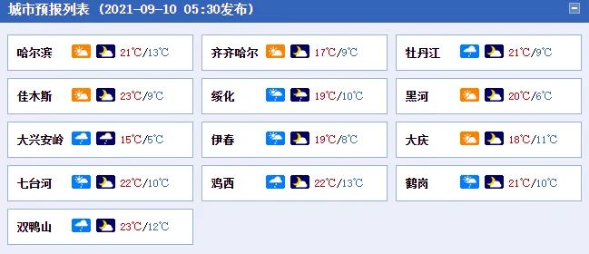 10日白天最高气温:大兴安岭16℃~18℃,黑河、伊春、齐齐哈尔18℃~20℃,其它地区20℃~22℃。