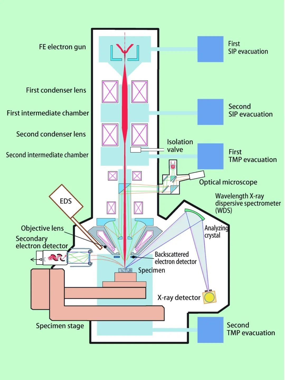 电子探针分析仪是广泛应用于材料科学、地球科学等领域的基础研究工具。它主要是利用聚焦的电子束去轰击固体样品表面,激发出样品中各种元素的特征X射线,再通过对X射线的波长和强度检测,实现对样品中元素组成和含量的测定。同时,激发出的二次电子、背散射电子也可以成像,提供样品表面高分辨率的形貌信息。