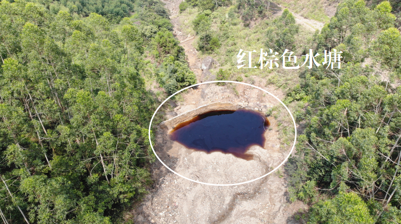 图2 贵港市金地矿业矿区范围内山间溪水沿废石堆场一路淋溶而下,形成红棕色水塘,水塘中氰化物、砷等指标超标
