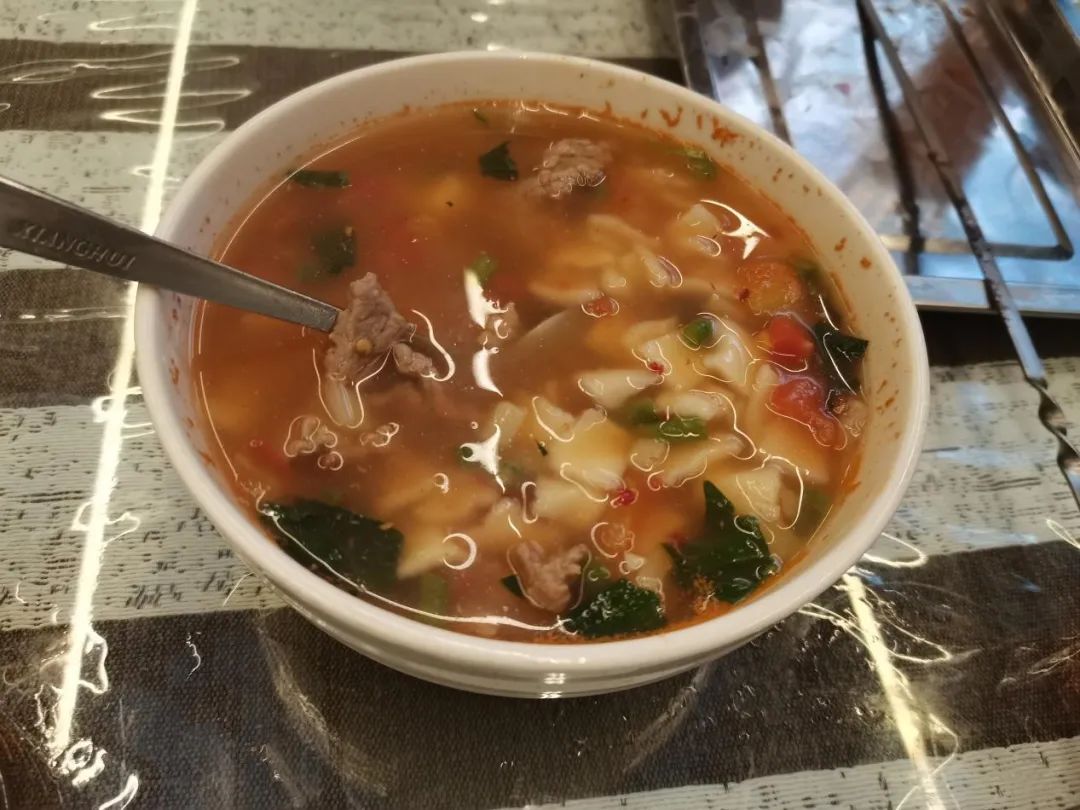 怎么就成了面疙瘩汤呢?听当地的居民讲因为晚饭时间吃的晚,他们又常吃牛羊肉,为了防止增加消化负担影响休息,常常晚饭吃碗汤饭,汤汤水水吃下去倒也舒服。手搓面也好,汤饭也好,这一些佳肴,都是新疆人民生活的一个反映。