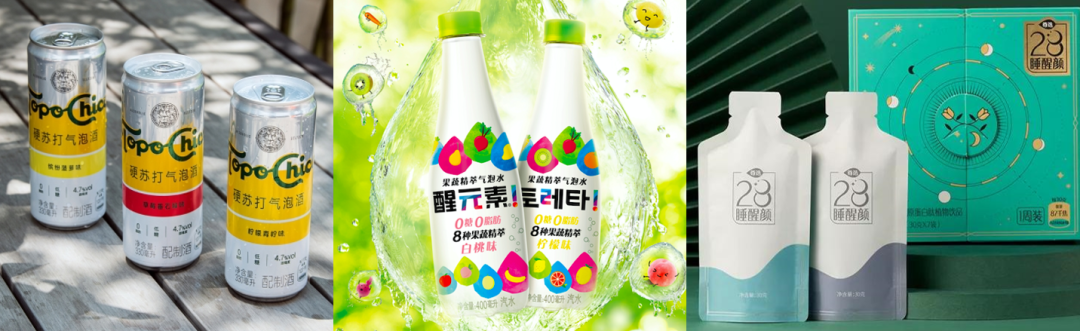 可口可乐公司6月在中国市场推出的硬苏打气泡酒Topo Chico,主打的就是低酒精度、低糖、零脂肪,此外还有果蔬精萃气泡水醒元素、植物饮品尊选28睡醒颜等等。而这些主打健康的饮料品牌只在包装瓶身背面留有较小的“可口可乐”logo,保证品牌形象的独立性,有助于减轻消费者对可口可乐固有“碳酸饮料”的印象所带来的影响。