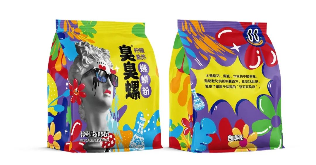 再比如创新米粉食品品牌“臭臭螺”,在同质化严重的螺蛳粉市场当中,“臭臭螺”在各地经典米粉的基础上做创新集合,搜罗各地美味米粉的同时,充满想象力地进行口味改造,在产品研发上推出柠檬紫苏、香菜、蒜香芝士等多种前卫的新口味,为米粉类爱好者们研发“充满脑洞的真香食品”,在“臭臭螺”包装的品牌沟通上,则显示出了其不拘一格的自我态度。