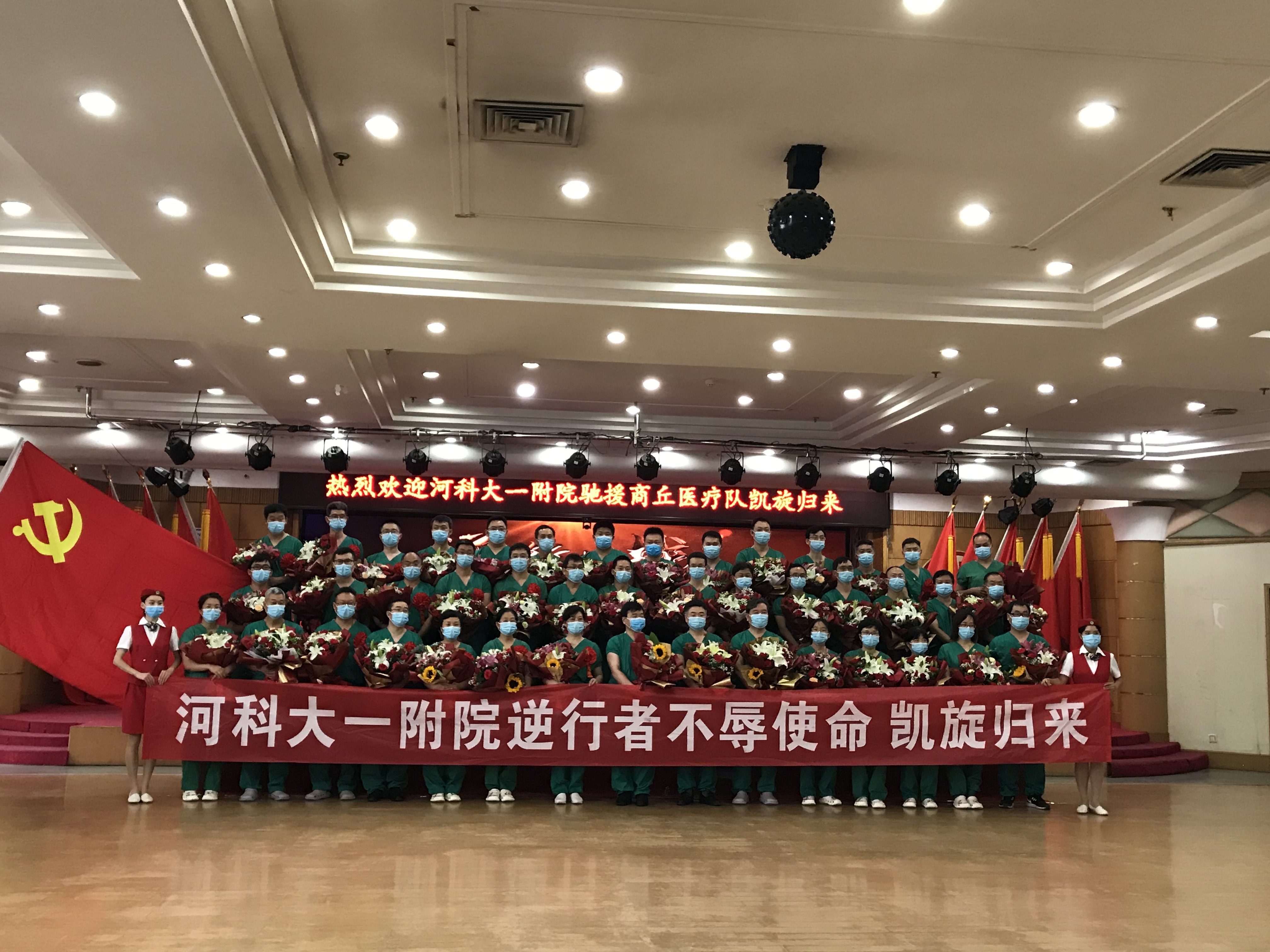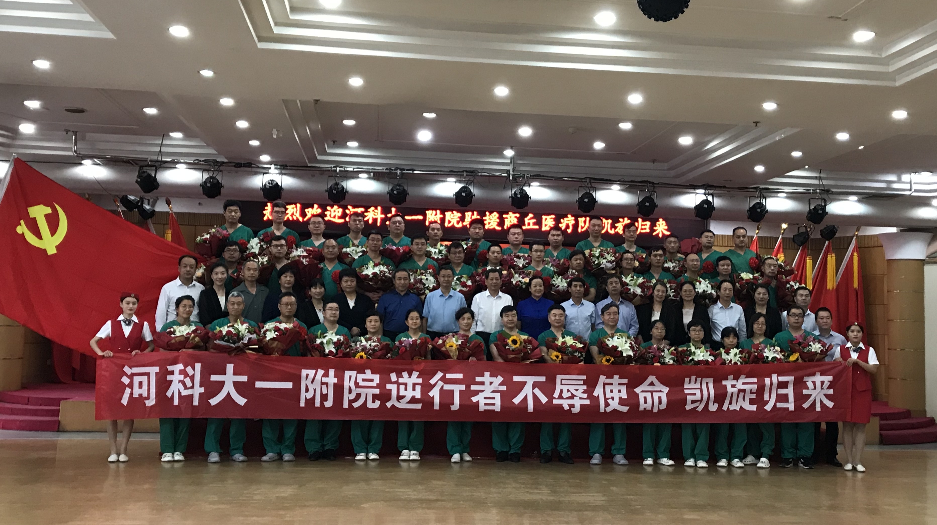 “欢迎英雄们回来,你们辛苦了!”9月5日,在大家的翘首以盼中,河南科技大学第一附属医院(以下简称河科大一附院)援助商丘医疗队队员们乘坐的大巴车缓缓驶进景华院区肿瘤医院的大门,医院党委书记董平栓带领医院领导们,手捧鲜花,在肿瘤医院门口热情迎接队员们,并送去亲切的问候。