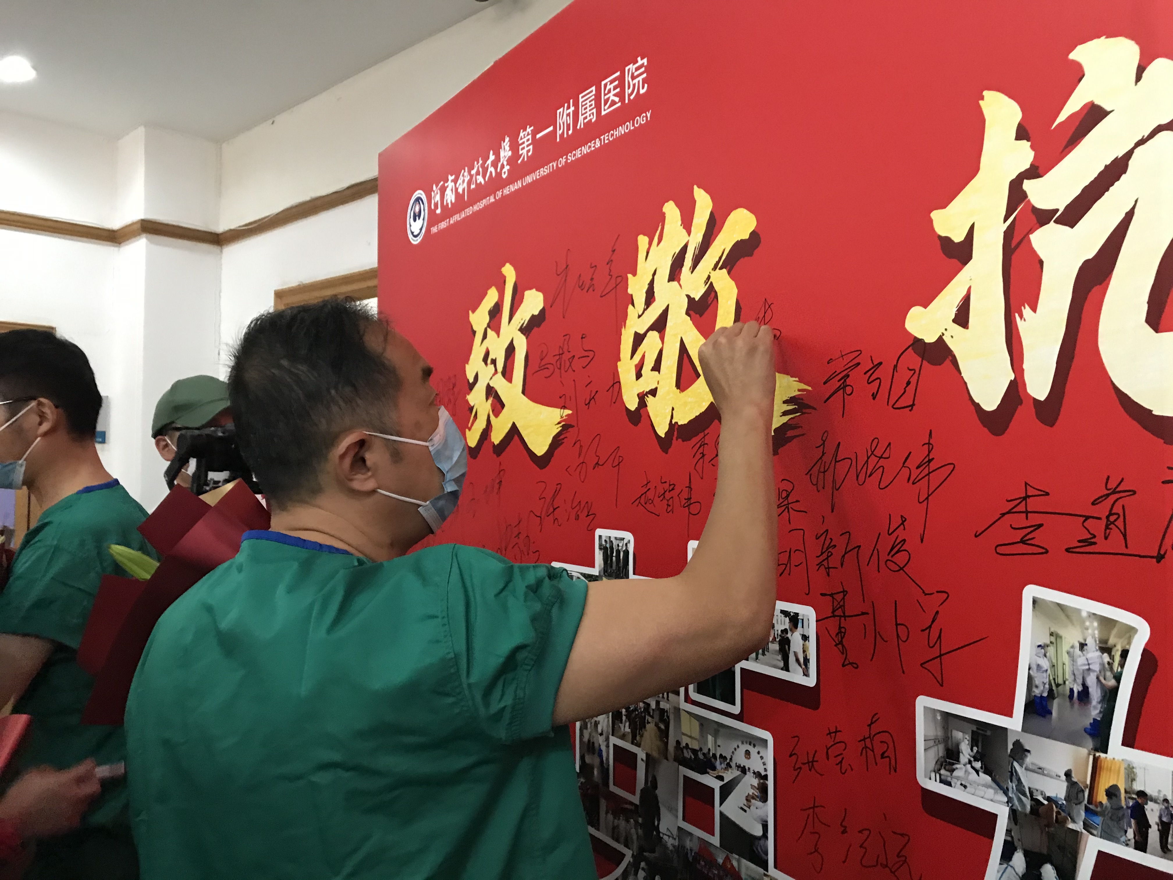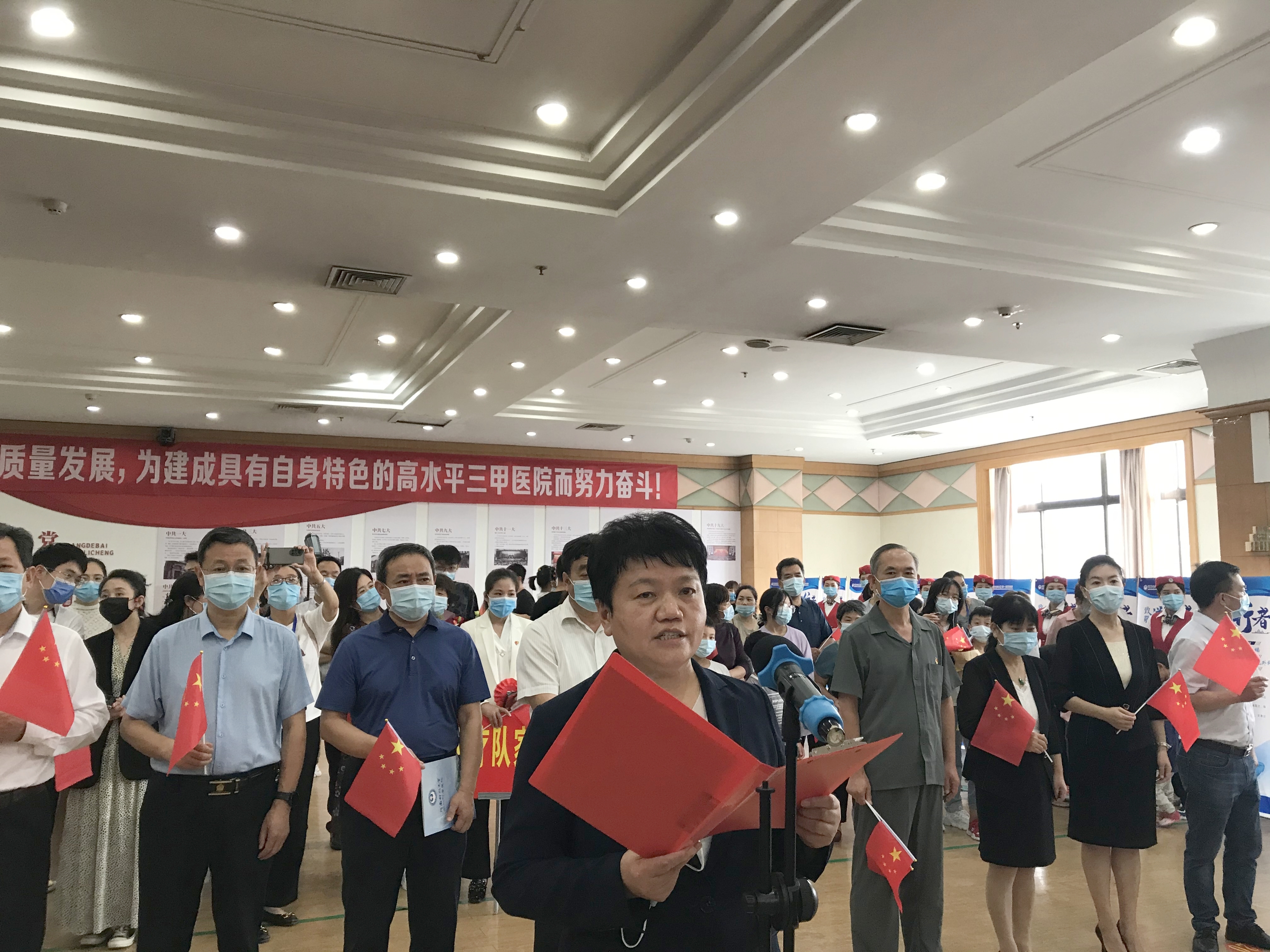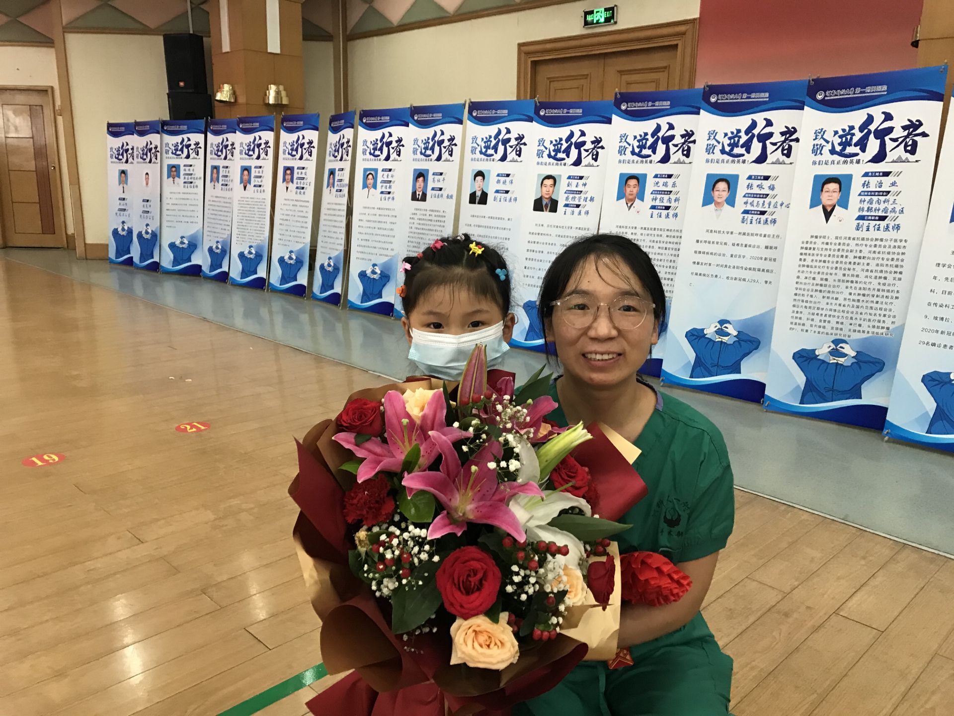 肿瘤医院一楼大厅内,由职工代表和队员家属们组成的欢迎方阵早早就挥舞着小红旗、拉着欢迎条幅,热烈欢迎队员们的凯旋。