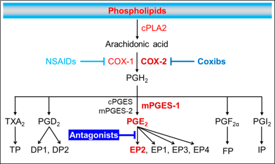 图1. COX-2/mPGES-1/PGE2/EP2信号通路(图片来源:J. Med. Chem.)
