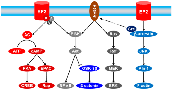 前列腺素受体EP2可与 Gs (由α、β和γ 亚基组成的异源三聚体)组成蛋白复合物。PGE2对EP2受体的激活将Gs复合物迅速分离为Gα和Gβγ,反过来又调节了不同的下游信号分子,这些分子也可以与许多其他途径进行交互(图2)。EP2受体的激活既可以导向G-蛋白偶联信号通路,也可以导向独立信号通路,这些通路通常与其他通路(包括 EGFR介导的信号传导)进行交互。因此,可以通过靶向EP2受体开发选择性小分子拮抗剂以缓解由EP2受体介导的下游病理过程。
