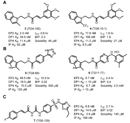 2008年,埃默里大学的研究人员利用一组基于细胞的时间分辨荧光共振能量转移 (TR-FRET) 分析cAMP形成,对262371种化合物进行了高通量筛选 (HTS)。由于当时缺乏真正的选择性EP2拮抗剂,他们的目标是开发选择性抑制 EP2受体的化合物,用于研究长期癫痫引起的脑部炎症。因此,一系列小分子被鉴定为人类EP2受体的竞争性拮抗剂。其中,化合物3(图5)最有效,其功能性Schild KB为2.4 nM,可拮抗PGE2,血浆半衰期(t1/2)为0.6小时,脑与血浆之比为0.3。随后的构-效关系发现了相关衍生物(4~7)(图5)。