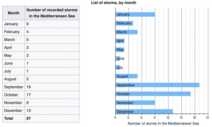根据维基百科的统计,地中海气旋的高发期为9月至次年1月。9月出现的气旋比较容易具备完全的热带性质,而10月及以后的气旋成因多半与切断低压和高空槽有关,具有温带气旋的一些性质,而且生成时海温都比较低,仅有22摄氏度左右,所以和真正的热带气旋相比还是存在差异(生成海域海温至少在26摄氏度以上),可以类比在我国渤海、黄海上出现的气旋。