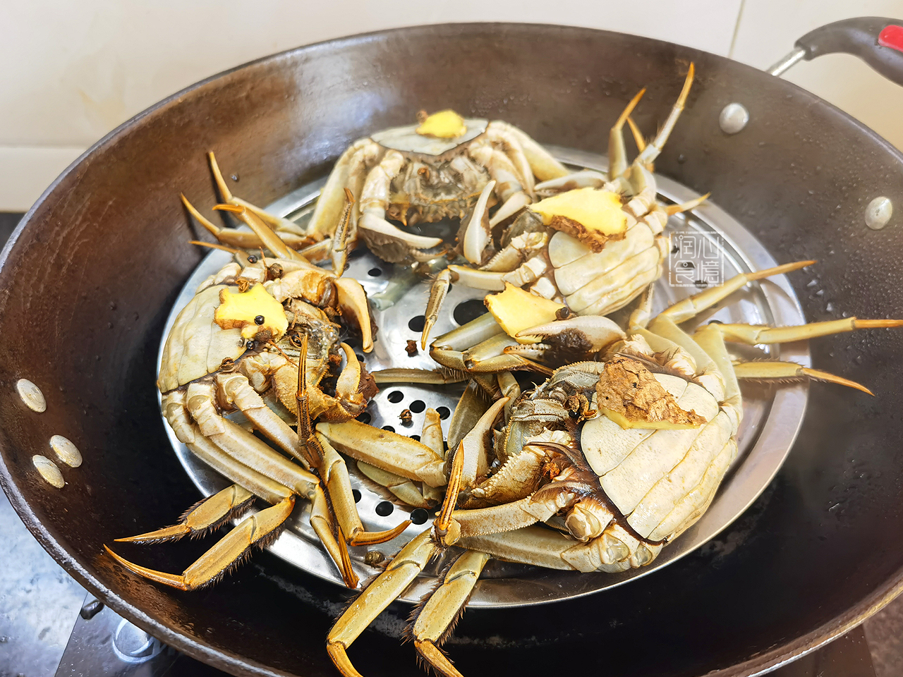 2、鲜活的螃蟹势必会挣扎到处乱爬,所以用牙签戳一戳蟹嘴,螃蟹就老实了。这样放到锅里的时候就不会到处乱爬了。锅里倒入足量的清水,放一个蒸屉或者蒸架,水里滴入一勺白酒,去腥增香。螃蟹腹部朝上,在螃蟹的肚子上分别放一片生姜,撒入一些花椒,有小葱的话也可以铺在螃蟹上。