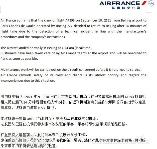 对此,法航回应称,2021年9月18日,由北京首都国际机场飞往巴黎戴高乐机场的AF393航班机组人员在起飞14分钟后因发现技术故障,依据飞机制造商的操作说明和公司的指示决定返航北京。 该航班由波音B777执飞。