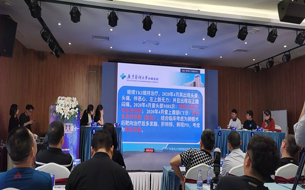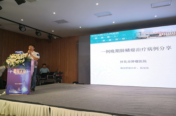 本次竞赛共分为长沙站、怀化站、邵阳站3个初赛区,来自怀化、岳阳、湘西自治州、益阳市等5家兄弟医院的选手参加了怀化站的初赛。比赛共分为两个部分,第一部分为幻灯演讲,每个选手进行一个临床病例分享,然后由评委对每个参赛选手的台风、病例的诊疗思路进行点评、提问并现场评分;第二部分为病例解析,由广东医科大学附属肿瘤医院陈华林教授分享病例并在诊疗过程中设置问题并要求参赛选手给出下一步诊疗思路。怀化市肿瘤医院大肿瘤内科主任廖东承带队参赛,胸部肿瘤内科杨瑞瑞主治医师汇报了一例“晚期肺鳞癌患者的诊疗”,该病例的诊疗方式与在院内MDT讨论模式获得现场评委一致认可。在第二部分病例解析环节,针对广东医科大学陈华林教授提出的四个问题,杨瑞瑞医师沉着冷静、思路清晰地作了规范而全面的解答,对疾病的下一步诊疗提出了可行性诊疗方案,杨瑞瑞医师以其全面的专业素养、精准的语言表达、严密的逻辑、敏捷的思维得到专家、评委及各同行的高度赞扬。